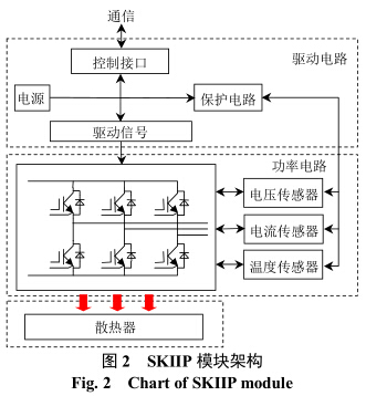 賽米控智能集成功率(Semikron integrated intel-ligent power,SKIIP)模塊[6]集成了功率半導(dǎo)體器件、散熱器以及具有保護(hù)和監(jiān)測電路的門極驅(qū)動電路,并具有用于短路和過電流保護(hù)的閉環(huán)電流傳感器,同時還集成了溫度傳感器。采用SKIIP模塊[6]可以大大簡化逆變器主電路,提高系統(tǒng)的抗干擾能力,該模塊具有標(biāo)準(zhǔn)接口,其架構(gòu)如圖2所示。