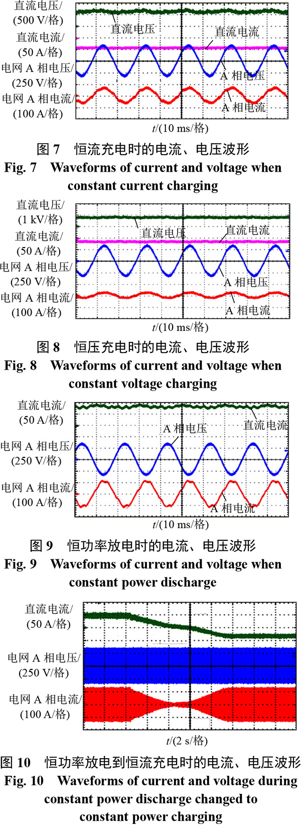利用本文儲能并網(wǎng)變換器實現(xiàn)方案研制了試驗樣機(jī),并進(jìn)行了鋰電池儲能系統(tǒng)充放電測試,具體試驗內(nèi)容為恒流充電、恒壓充電、恒功率放電以及由充電到放電的過渡。
