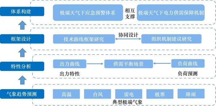 新能源出力具有波動(dòng)性,高比例新能源接入的新型電力系統(tǒng),其功率和能量靈活平衡需求顯著提高;極端天氣頻發(fā)趨勢(shì)將進(jìn)一步放大新能源發(fā)電隨機(jī)性及波動(dòng)性對(duì)電力系統(tǒng)安全運(yùn)行的不利影響。針對(duì)全球氣候變暖趨勢(shì),研究我國(guó)大型新能源基地、負(fù)荷中心等送受端地區(qū)的極端氣象特征與演變趨勢(shì),揭示典型極端氣象場(chǎng)景影響電力供給及負(fù)荷需求側(cè)的作用機(jī)理與傳導(dǎo)機(jī)制。結(jié)合高溫、臺(tái)風(fēng)、雷電等極端天氣的歷史事件,新能源的出力特性、負(fù)荷特性,分析極端天氣頻發(fā)條件下的電力供需平衡場(chǎng)景與風(fēng)險(xiǎn);從組織、管理、技術(shù)等維度,形成應(yīng)對(duì)極端氣象的電力供需保障技術(shù)框架與應(yīng)急組織機(jī)制(見(jiàn)圖4)。