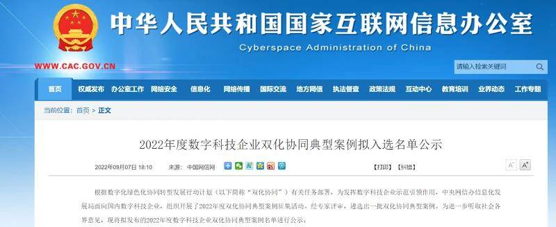 9月7日,中央網信辦信息化發(fā)展局公示2022年度數(shù)字科技企業(yè)雙化協(xié)同典型案例擬入選名單,廣域銘島入圍名單。