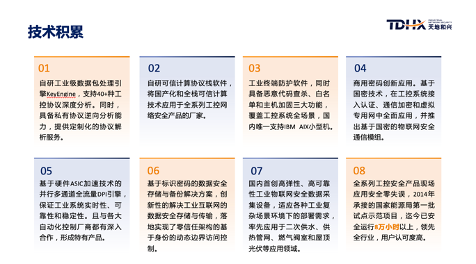 本次活動中,副總裁楊小帥更近一步向大家介紹了天地和興深厚的技術(shù)積累:自研工業(yè)級數(shù)據(jù)包處理引擎KeyEngine,支持40+種工控協(xié)議深度分析;自研可信計算協(xié)議棧軟件,是將國產(chǎn)化和全棧可信計算技術(shù)應用于全系列工控網(wǎng)絡(luò)安全產(chǎn)品的廠商;工業(yè)終端防護軟件,覆蓋工控系統(tǒng)全場景,還是國內(nèi)唯一支持IBM AIX小型機;商用密碼創(chuàng)新應用,并推出基于國密的物聯(lián)網(wǎng)安全通信模組;基于硬件ASIC加速技術(shù)的并行多通道全流量DPI引擎,保證工業(yè)系統(tǒng)實時性、可靠性和穩(wěn)定性;基于標識密碼的數(shù)據(jù)安全存儲與備份解決方案,創(chuàng)新性的解決工業(yè)互聯(lián)網(wǎng)的數(shù)據(jù)安全存儲與傳輸;國內(nèi)首創(chuàng)高彈性、高可靠性工業(yè)物聯(lián)網(wǎng)安全數(shù)據(jù)采集設(shè)備,適應各種工業(yè)復雜場景環(huán)境下的部署需求;全系列工控安全產(chǎn)品現(xiàn)場應用安全零失誤,2014年承接的國家能源局第一批試點示范項目,迄今已安全運行8萬小時以上。