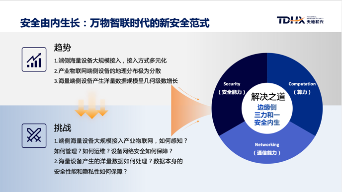 工業(yè)和信息化部研究機構(gòu)數(shù)據(jù)顯示:我國工業(yè)互聯(lián)網(wǎng)產(chǎn)業(yè)規(guī)模目前已邁過了“萬億”大關(guān),并進一步刺激了數(shù)字經(jīng)濟在工業(yè)領(lǐng)域的廣泛應用,工業(yè)制造的數(shù)字化和網(wǎng)絡(luò)化催生出巨大的網(wǎng)絡(luò)安全需求。天地和興CTO李凱斌介紹:數(shù)字經(jīng)濟大背景下,萬物智聯(lián)時代將面臨新安全挑戰(zhàn),即:1、端側(cè)海量設(shè)備大規(guī)模接入產(chǎn)業(yè)物聯(lián)網(wǎng),如何感知?如何管理?如何運維?設(shè)備網(wǎng)絡(luò)安全如何保障?2、海量設(shè)備產(chǎn)生的洋量數(shù)據(jù)如何處理?數(shù)據(jù)本身的安全性能和隱私性如何保障?而解決之道在于“三力合一”:安全能力、算力、通信能力,三者合一。安全,由內(nèi)生長。