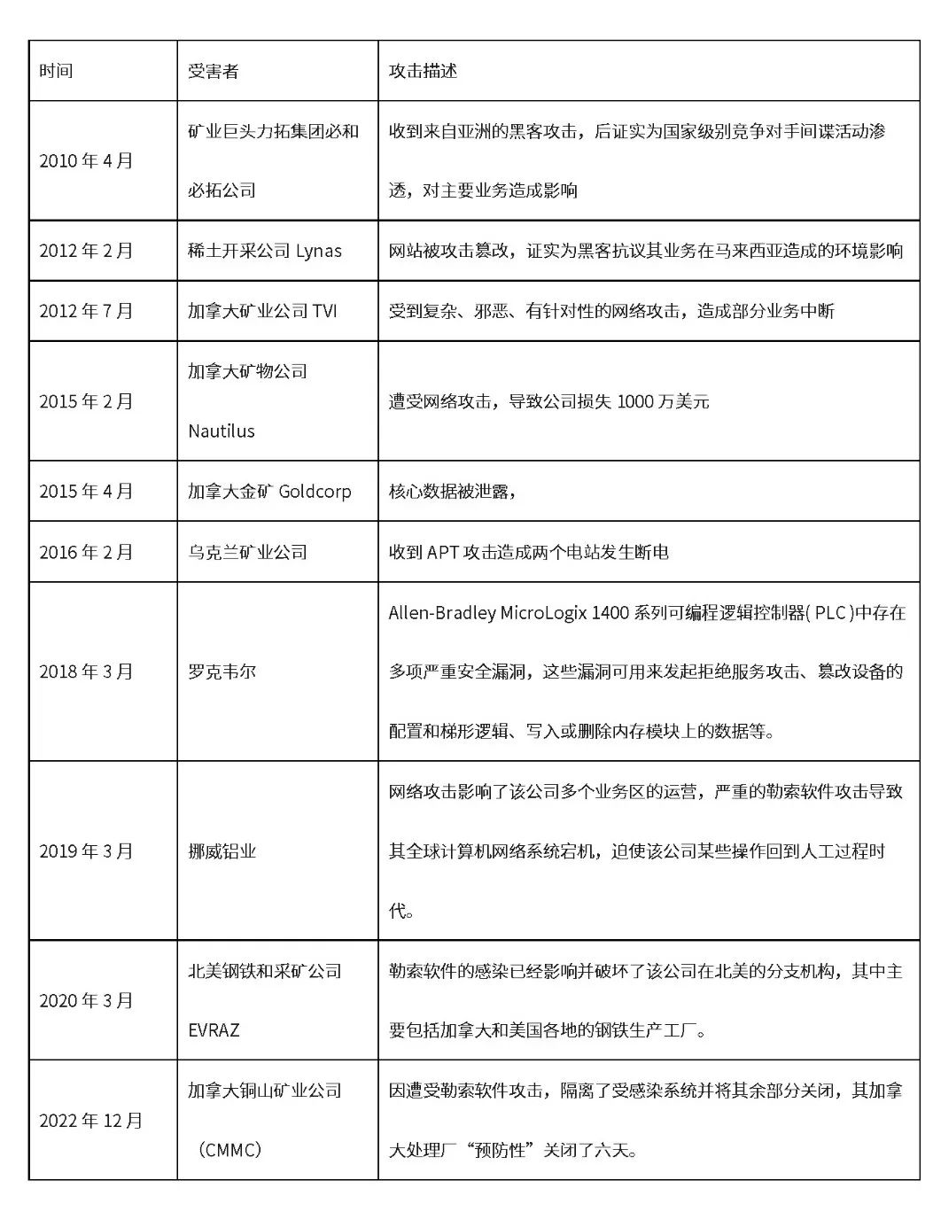 但隨著原有封閉的礦山工業(yè)控制系統(tǒng)與開放的信息化系統(tǒng)融合,也帶來(lái)了大量的網(wǎng)絡(luò)安全威脅。而大型礦山企業(yè)工業(yè)網(wǎng)絡(luò)復(fù)雜,存在較多的管理薄弱環(huán)節(jié),更容易受到來(lái)自外部的惡意攻擊或內(nèi)部操作失誤所引起的網(wǎng)絡(luò)異常,由此造成停產(chǎn)和監(jiān)管部門處罰將會(huì)給企業(yè)造成大量損失。從國(guó)際上來(lái)看,有下列較為嚴(yán)重的網(wǎng)絡(luò)攻擊案例: