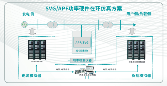 在電力系統(tǒng)應(yīng)用場(chǎng)景中,PAS放大器與仿真器的結(jié)合,能夠?qū)Πl(fā)電側(cè)和負(fù)載側(cè)進(jìn)行數(shù)字化模擬,結(jié)合功率檢測(cè)儀的實(shí)測(cè)數(shù)據(jù),通過(guò)數(shù)據(jù)采集系統(tǒng),可實(shí)現(xiàn)以APF,SVG為被測(cè)設(shè)備的半實(shí)物功率硬件在環(huán)仿真測(cè)試。