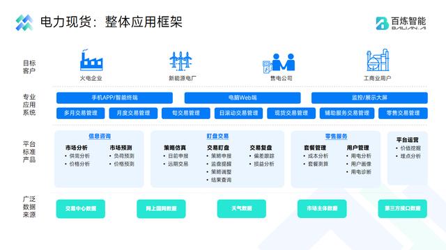 為了幫助發(fā)售電企業(yè)加速電力交易轉(zhuǎn)型,百煉智能基于先進(jìn)的AI及數(shù)據(jù)分析技術(shù)、系統(tǒng)開發(fā)能力,自主研發(fā)“百煉智電”產(chǎn)品,為發(fā)售電企業(yè)建設(shè)一站式電力現(xiàn)貨市場交易及決策平臺(tái),強(qiáng)化企業(yè)管控水平、決策能力以及用戶服務(wù)能力,實(shí)現(xiàn)電力交易收益最大化。