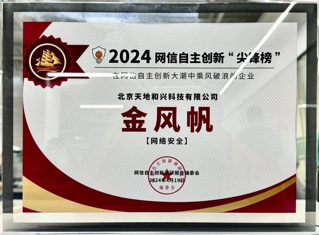 在報告發(fā)布之際,報告編委會推選了具有突出創(chuàng)新能力、取得顯著創(chuàng)新成果、能夠代表創(chuàng)新水平、做出卓越創(chuàng)新貢獻(xiàn)的企業(yè)等予以表彰。天地和興作為在網(wǎng)信自主創(chuàng)新大潮中乘風(fēng)破浪的企業(yè),被授予2024網(wǎng)信自主創(chuàng)新尖鋒榜“金風(fēng)帆獎”。