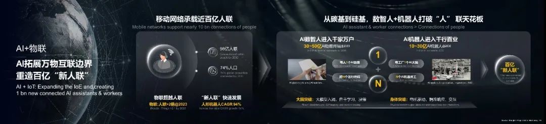 第三,移動AI時代將極大拓展萬物互聯(lián)的邊界。隨著機器獲得類人的思維和移動性能力,網(wǎng)絡(luò)聯(lián)接將從“碳基人”拓展到“硅基人”,再造百億新人聯(lián)。對于個人,未來每個人都將擁有一個AI助理,跨手機、眼鏡和新型AI終端運行。AI數(shù)智人從工具進化為伙伴,實時響應(yīng)生活、工作、學(xué)習(xí)全場景需求;對于行業(yè),每一個智慧工廠將配備AI大腦,驅(qū)動AI機器員工深入各生產(chǎn)環(huán)節(jié)。AI機器員工將具備自主學(xué)習(xí)和精準響應(yīng)的能力,使能生產(chǎn)、維護、質(zhì)檢、物流等全場景提質(zhì)增效。“數(shù)智人”和“機器人”將突破傳統(tǒng)聯(lián)接天花板,創(chuàng)造數(shù)百億的“新人聯(lián)”,引領(lǐng)人機融合的新紀元。