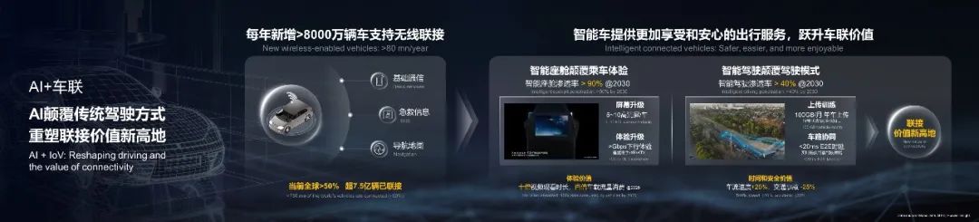 第二,智能網(wǎng)聯(lián)汽車將顛覆傳統(tǒng)駕駛方式,提供更加愉悅和安心的出行服務(wù)。智能座艙,將顛覆人們的乘車體驗。Gbps網(wǎng)絡(luò)體驗支持智慧助手、多屏觀看和XR應(yīng)用等需求,使車輛成為集休閑、娛樂和工作于一體的'移動第三空間'。智能駕駛,將顛覆傳統(tǒng)的駕駛模式。通過每月百GB的數(shù)據(jù)上傳訓(xùn)練,智駕系統(tǒng)不斷提高模型準確性,精準識別和響應(yīng)多樣化交通環(huán)境;同時,基于毫秒級的車路協(xié)同,將實時提供穩(wěn)定可靠的駕駛策略。智能網(wǎng)聯(lián)汽車將兌現(xiàn)車聯(lián)體驗價值,進一步帶來時間價值和安全價值,重塑聯(lián)接價值的新高地。