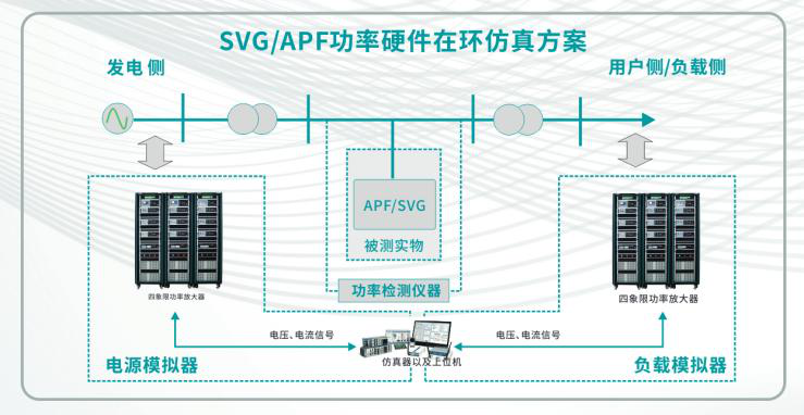 SVG/APF功率硬件在環(huán)仿真方案:在新型電力系統(tǒng)應(yīng)用場景中,PAS放大器與仿真器的結(jié)合,能夠?qū)Πl(fā)電側(cè)和負(fù)載側(cè)進(jìn)行數(shù)字化模擬,結(jié)合功率檢測儀的實(shí)測數(shù)據(jù),通過數(shù)據(jù)采集系統(tǒng),可實(shí)現(xiàn)以APF,SVG為被測設(shè)備的半實(shí)物功率硬件在環(huán)仿真測試。