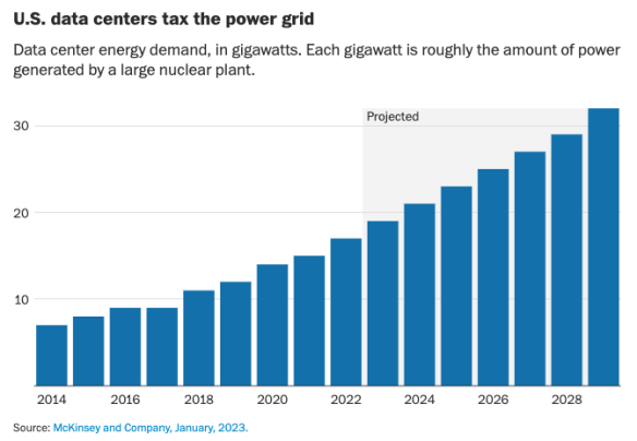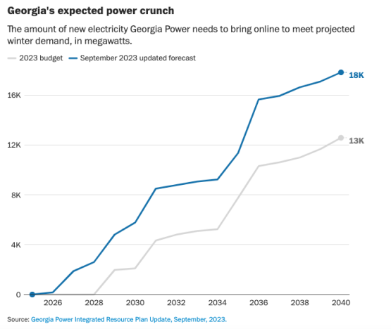 在佐治亞州,對工業(yè)電力的需求正在飆升至歷史新高,預(yù)計未來十年的新增用電量將是現(xiàn)在的17倍。亞利桑那州公共服務(wù)公司是該州最大的公用事業(yè)公司,它預(yù)計如果不進行重大升級,21世紀末將嚴重缺電。弗吉尼亞州北部所有計劃和在建的新數(shù)據(jù)中心需要幾個大型核電站才能保障供電。德克薩斯州在炎熱的夏季電力短缺已經(jīng)成為常態(tài),也面臨著同樣的困境。