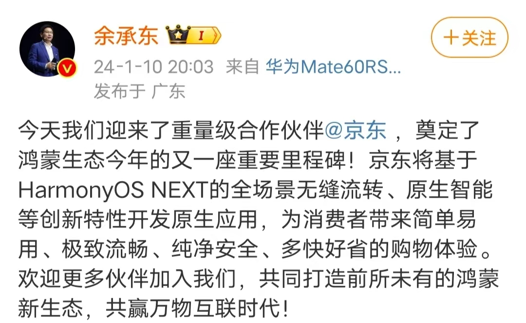華為常務(wù)董事、終端業(yè)務(wù)CEO、智能汽車解決方案BU董事長余承東在微博發(fā)文稱:“今天我們迎來了重量級合作伙伴京東,奠定了鴻蒙生態(tài)今年的又一座重要里程碑!