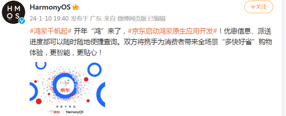 1月10日晚,HarmonyOS微博發(fā)文稱:京東啟動鴻蒙原生應(yīng)用開發(fā),雙方將攜手為消費(fèi)者帶來全場景“多快好省”購物體驗,更智能,更貼心。