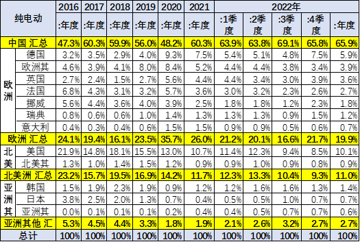 此處具體分析特意不包含商用車市場分析,主要是世界新能源的卡車與客車主要銷量基本在中國,而且疫情后新能源客車處于萎縮中,雖然增大一點(diǎn)中國份額,但容易誤導(dǎo)趨勢的分析,意義不大,因此此文第二部分開始的分析只包含乘用車。