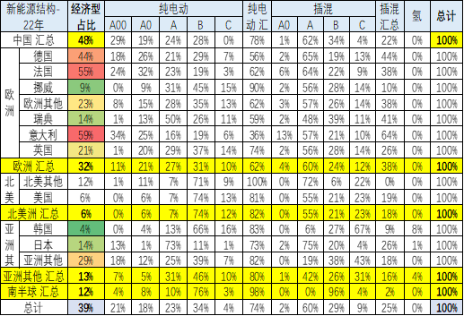 2022年的世界新能源車結(jié)構(gòu)是中國偏純電動(dòng)。歐洲主力國家市場插混較強(qiáng),歐洲市場結(jié)構(gòu)的純電與插混持平的特征明顯,挪威等非汽車生產(chǎn)國家的純電動(dòng)較強(qiáng)。