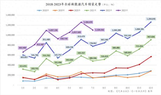參考?xì)v年來的走勢(shì),可知今年剩下5個(gè)月全球新能源市場(chǎng)的單月銷量應(yīng)該都將保持在110萬輛以上。