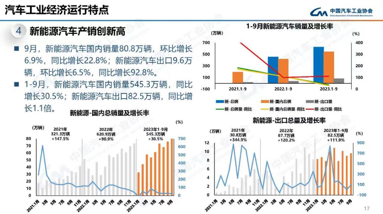 今年1月-9月,新能源汽車?yán)塾?jì)產(chǎn)銷已經(jīng)達(dá)到631.3萬輛和627.8萬輛,同比分別增長33.7%和37.5%,市場占有率達(dá)29.8%。而前三季度,新能源汽車國內(nèi)銷量545.3萬輛,同比增長30.5%;出口量為82.5萬輛,同比增長1.1倍。
