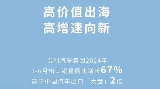昨日,吉利汽車發(fā)布數(shù)據(jù)顯示,2024年上半年吉利汽車出口累計(jì)銷量達(dá)19.74萬輛,同比增長67%,高于中國汽車出口大盤兩倍,銷量、增速均創(chuàng)歷史新高。