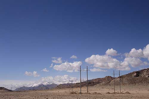 項(xiàng)目身處青海都蘭一望無際的戈壁灘,氣候干燥,風(fēng)沙肆虐,寒風(fēng)刺骨,自然條件十分惡劣,電話信號時(shí)有時(shí)無。春夏相接的五月,沙塵暴和冰雹更是常常輪番“光顧”施工現(xiàn)場,給施工進(jìn)度和安全管理帶來不小的挑戰(zhàn)。對此,中國安能第二工程局青海風(fēng)電項(xiàng)目部員工對工作沒有絲毫懈怠,大家精誠團(tuán)結(jié)、眾志成城,施工生產(chǎn)穩(wěn)步推進(jìn)。此次放線工作于5月28日在5#地塊正式開始,該區(qū)段包含146基鐵塔,放線長度37900米,109.8噸重的導(dǎo)線翻越山巒,在平均海拔3000米的荒漠戈壁攀行30天,最終于五標(biāo)段2-G67號塔位進(jìn)行交匯。