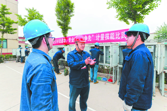 張遠(yuǎn)平(左)在計量專業(yè)技能比武活動現(xiàn)場,向選手講解裝表接電技術(shù)要點。黃曉東 攝