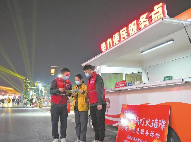 國家電網河北電力(知愛正定)共產黨員服務隊隊員在正定南城門景區(qū)門口為游客講解安全用電知識。王璞詩 攝