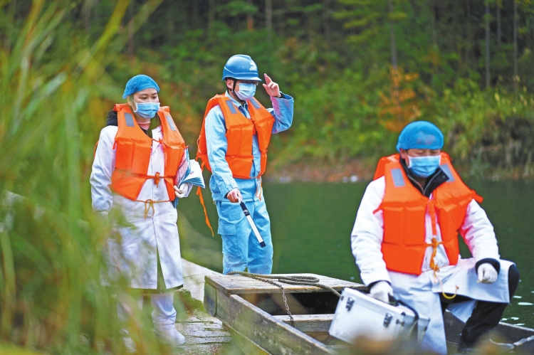 2月8日,在臺江縣革一鎮(zhèn)排生村,臺江供電局臺盤供電所黨員王清亮和當?shù)匦l(wèi)生部門工作人員乘船前往工作點?!㈤_福 攝影報道