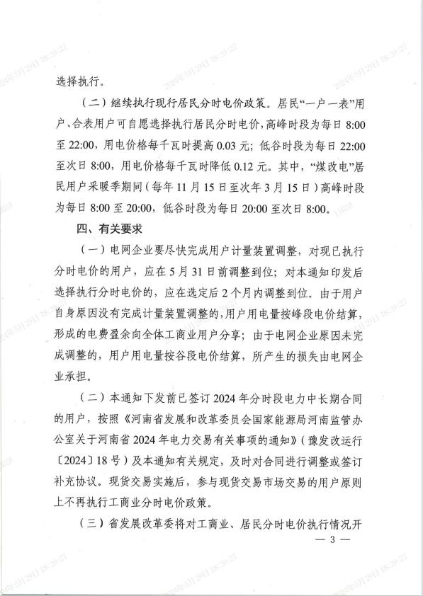(二)本通知下發(fā)前已簽訂2024年分時(shí)段電力中長期合同的用戶,按照《河南省發(fā)展和改革委員會(huì)國家能源局河南監(jiān)管辦公室關(guān)于河南省2024年電力交易有關(guān)事項(xiàng)的通知》(豫發(fā)改運(yùn)行〔2024〕18號(hào))及本通知有關(guān)規(guī)定,及時(shí)對(duì)合同進(jìn)行調(diào)整或簽訂補(bǔ)充協(xié)議?,F(xiàn)貨交易實(shí)施后,參與現(xiàn)貨交易市場交易的用戶原則上不再執(zhí)行工商業(yè)分時(shí)電價(jià)政策。