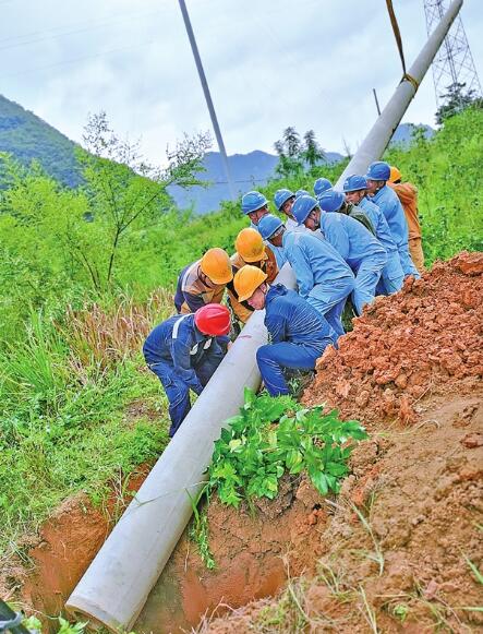 7月13日,在百色市德保縣城關(guān)鎮(zhèn)云梯村足斗屯電網(wǎng)改造現(xiàn)場,施工人員合力把電桿移進(jìn)桿坑里。 冉袖言 攝