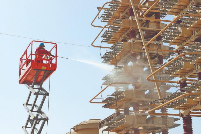 黨員突擊隊(duì)隊(duì)員在±800千伏靈州換流站年度檢修現(xiàn)場沖洗交流濾波器。