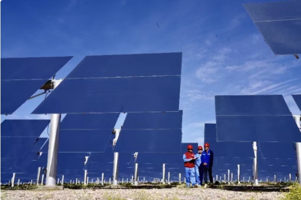 國(guó)網(wǎng)海西供電公司工作人員在青海中控德令哈50兆瓦光熱電站了解企業(yè)發(fā)電情況,助力新能源消納