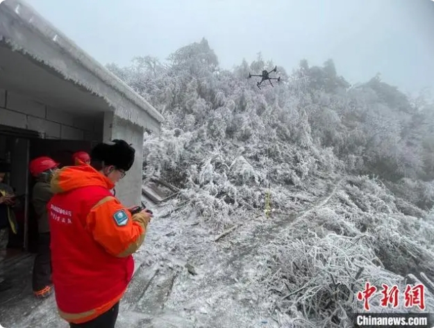 晉電援湘抗冰突擊隊隊員利用無人機(jī)觀察冰情。國網(wǎng)山西省電力公司供圖