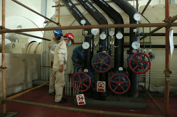 攻堅克難,保機組穩(wěn)定運行。大鵬之動,非一羽之輕也;騏驥之速,非一足之力也。盛夏的廠房內(nèi)異常悶熱,機組設(shè)備發(fā)出來的熱量讓人喘不過氣來,就在這種條件下,該廠干部職工為了快速消除缺陷,不懼困難,連續(xù)奮戰(zhàn)在現(xiàn)場??偣こ處煻诖蠹易⒁獍踩?,輪換休息,防止中暑,并協(xié)調(diào)解決工器具及材料,查看作業(yè)環(huán)境,檢查安全措施;設(shè)備部積極與哈爾濱電機廠取得聯(lián)系,請專業(yè)人員入廠探討解決方法,同時編制安全技術(shù)組織措施方案,解決設(shè)備作業(yè)過程中遇到的技術(shù)性問題,對設(shè)備作業(yè)過程中出現(xiàn)的質(zhì)量問題提出整改意見;安監(jiān)部強化監(jiān)督,從兩票控制措施執(zhí)行、腳手架及現(xiàn)場防爆行燈漏電保護器的使用情況到確認施工現(xiàn)場氫氣含量等無死角的全程檢查盯守,為消缺工作保駕護航;發(fā)電部運行人員全力配合,嚴格按照工作票所列危險點布置安全措施,開關(guān)閥門,在檢修期間密切監(jiān)視發(fā)電機風(fēng)溫,發(fā)現(xiàn)問題及時對參數(shù)進行調(diào)整,在保證機組安全運行的基礎(chǔ)上,為消缺工作創(chuàng)造便利條件;電氣車間電機班人員分解氫冷器冷卻水出、入口法蘭短接及彎頭,在氫冷器冷卻水入口法蘭處加裝堵板,把配制好的藥液從氫冷器冷卻水出口彎頭處注滿氫冷器。工作中大家分工明確,忙而不亂,盡管現(xiàn)場氣溫高,卻沒有阻擋大家的干勁。