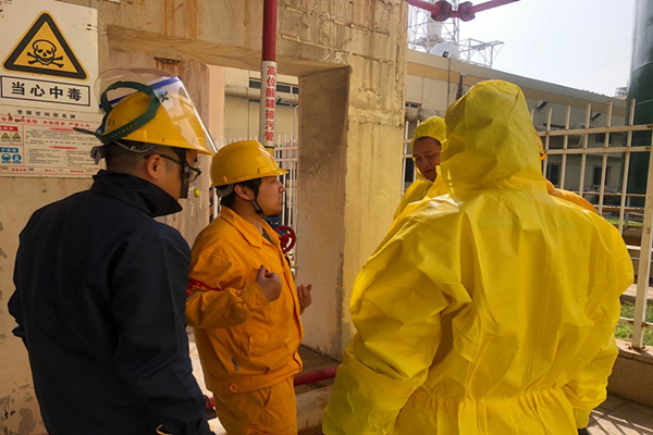 中國電力網(wǎng)訊 10月22日,南京化學(xué)工業(yè)園熱電有限公司(以下簡稱公司)開展二期水處理鹽酸儲罐本體泄漏的應(yīng)急演練,本次演練采用實(shí)戰(zhàn)演練方式進(jìn)行,發(fā)電部一期集控丙值運(yùn)行人員參加本次演練,化學(xué)人員進(jìn)行監(jiān)護(hù)。