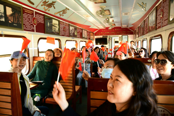 車廂內(nèi)女職工們一邊欣賞沿途美景,一邊自由暢談?!饵h史知識》、《女職工勞動保護特別規(guī)定》環(huán)節(jié)大家爭先恐后舉手,氣氛熱烈有趣,在搶答過程中既學(xué)習(xí)到黨史知識又增添了學(xué)習(xí)的趣味。全體人員集體合唱《我和我的祖國》,在歌聲中現(xiàn)場氣氛達(dá)到了高潮。下車后,大家來到黨建主題廣場參觀學(xué)習(xí)。
