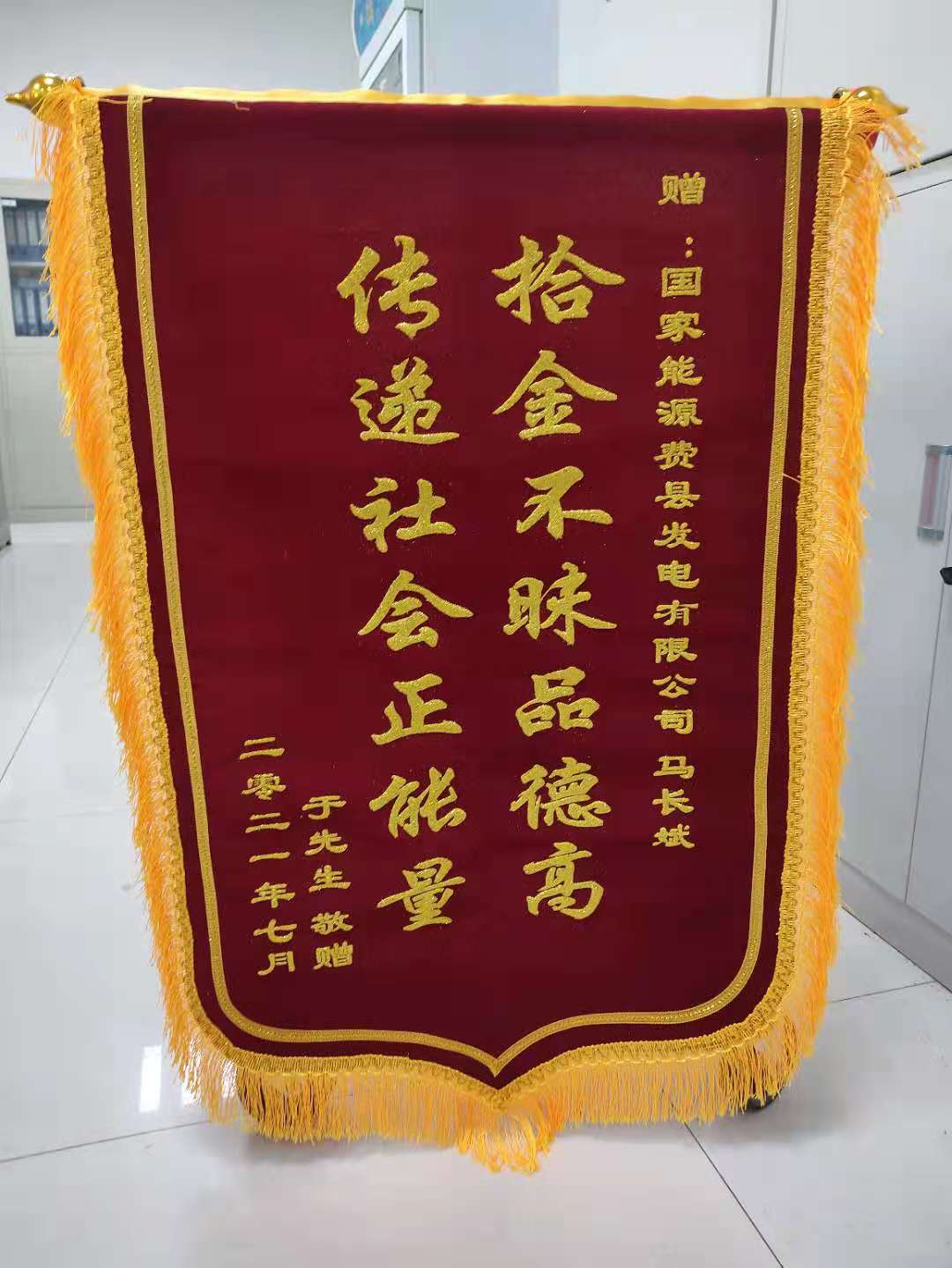 7月26日上午十點,費縣于先生懷著無比激動的心情將一面錦旗送到公司東門值班室,錦旗上書寫著:“贈國家能源費縣發(fā)電有限公司馬長斌:拾金不昧品德高,傳遞社會正能量”。