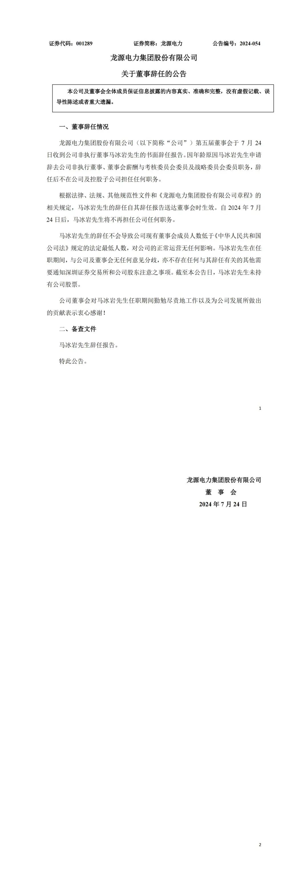 龍源電力集團股份有限公司發(fā)布公告稱,第五屆董事會于7月24日收到公司非執(zhí)行董事馬冰巖先生的書面辭任報告。因年齡原因馬冰巖先生申請辭去公司非執(zhí)行董事、董事會薪酬與考核委員會委員及戰(zhàn)略委員會委員職務,辭任后不在公司及控股子公司擔任任何職務。