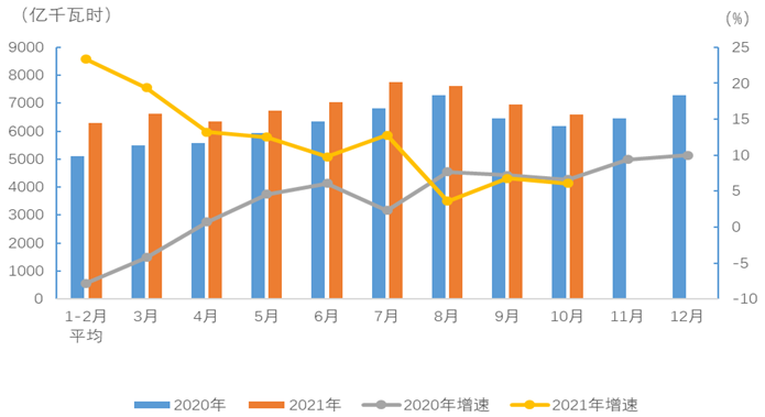 圖1 2020、2021年分月全社會(huì)用電量及其增速