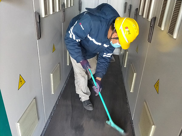 該電站毗鄰當?shù)貫跆m布和沙漠,廠址周邊植被少,冬季多為大風(fēng)天氣,為防止光伏板被風(fēng)吹落,該公司運維人員對光伏組件基礎(chǔ)進行細致檢查,對相對薄弱的區(qū)域進行埋石填土加固,對組件支架銹蝕的螺栓及時進行更換,對傾斜的立柱進行校正固定;站內(nèi)防凍措施已提前落實,但隨著氣溫的降低,相關(guān)防護需要每日一檢,該公司運維人員對生活水井的保暖措施進行再加固,在井蓋上方罩住多層保溫被,隔離井口積水,為閥門制作防護罩,保證生活用水正常供應(yīng),同時對電暖氣和空調(diào)開展全面檢查,對用電負荷電流進行鉗測,避免過負荷故障和火災(zāi)事故;在主設(shè)備風(fēng)沙防治上,這群年輕人狠下功夫,他們每天在太陽下山前開好工作票,在太陽下山后做好安全措施,集中清掃逆變器室和箱變室塵土和更換濾網(wǎng),每日清掃一組,一個月一輪回,解決逆變器及箱變積沉較多、散熱不良問題;在送出線路檢查上,他們每日對17條站內(nèi)線路和1條送出線路進行徒步巡線,細致檢查桿塔金具、導(dǎo)線、地線固定情況,并利用夜間停電機會及時消除異常隱患,保證涉網(wǎng)設(shè)備正常運行。