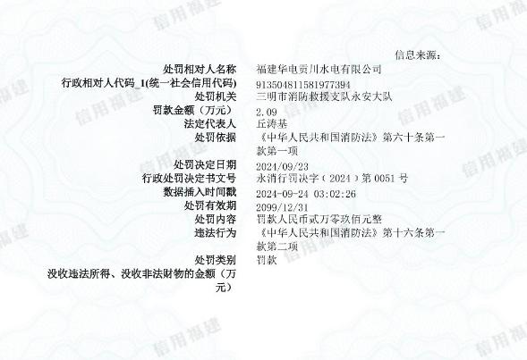 近日,福建華電貢川水電有限公司因相關(guān)違法行為,被三明市消防救援支隊永安大隊罰款。