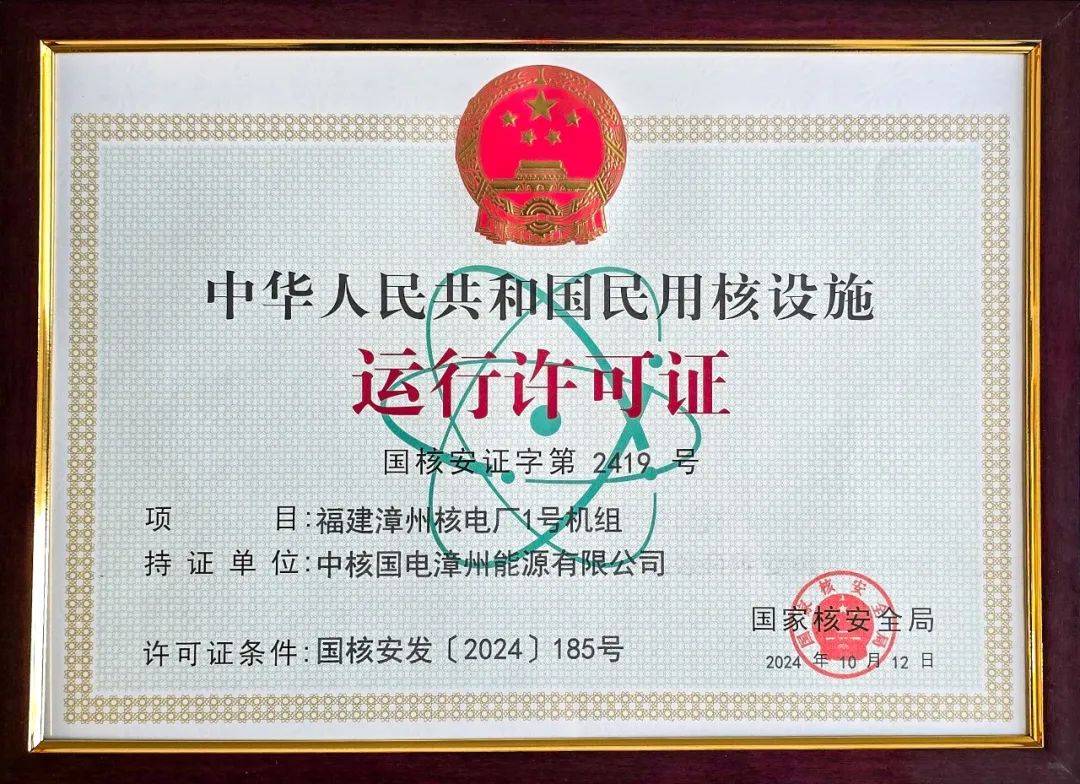 10月12日,生態(tài)環(huán)境部向中核集團旗下中國核電(股票代碼:601985)投資控股的漳州核電1號機組頒發(fā)運行許可證。生態(tài)環(huán)境部副部長、國家核安全局局長董保同出席儀式并為漳州能源頒發(fā)許可證,中核集團黨組成員、副總經理張凱出席并見證頒證儀式。15時18分,漳州核電1號機組開始裝載首爐核燃料,標志著機組進入主系統(tǒng)帶核調試階段,為后續(xù)機組臨界、并網(wǎng)發(fā)電等工作奠定了堅實基礎。