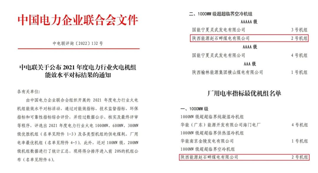 中國電力網(wǎng)訊  6月29日,從中電聯(lián)傳來喜訊,趙石畔煤電公司2號(hào)機(jī)組榮獲2021年度電力行業(yè)1000MW級(jí)超超臨界空冷機(jī)組指標(biāo)對(duì)標(biāo)“AAAAA級(jí)優(yōu)勝機(jī)組”及“廠用電率指標(biāo)最優(yōu)機(jī)組”。