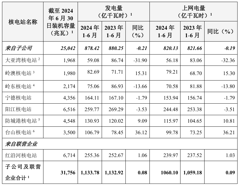中國廣核公告披露2024年第二季度運營情況,2024年1月至6月份,中國廣核及其子公司運營管理的核電機(jī)組總發(fā)電量約為1,133.78億千瓦時,較去年同期增長0.08%??偵暇W(wǎng)電量約為1,060.10億千瓦時,較去年同期增長0.09%。