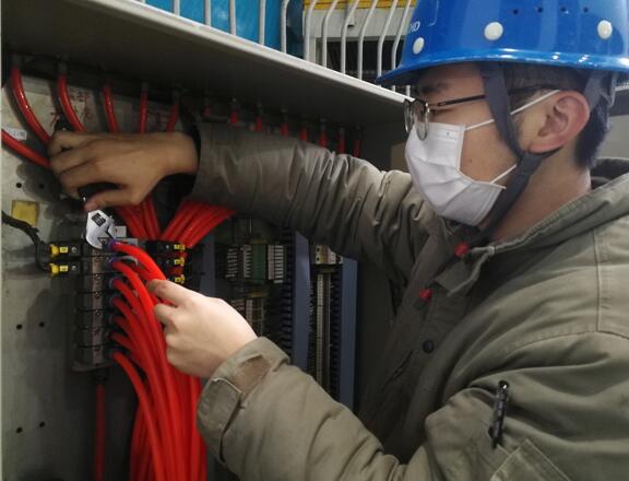 林躍正在給#2斗輪機變頻控制柜二次回路查線緊線