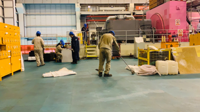在大修尾聲,我又看到了一個(gè)背影。他正背對著我,一絲不茍地清潔著剛剛“撤場”完畢后的地面,發(fā)揮著工完料盡場地清的傳統(tǒng)“藝能”——他的衣服已經(jīng)汗透,緊緊地貼在背上,我看不見他的臉,卻依然尊敬地對著他,舉起了相機(jī)。