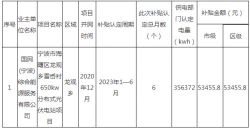 根據(jù)《寧波市家庭屋頂光伏補(bǔ)貼專項(xiàng)資金管理暫行辦法》(甬發(fā)改能源〔2018〕36號(hào))、《海曙區(qū)節(jié)能降耗專項(xiàng)資金管理辦法》(海發(fā)改〔2019〕36號(hào))等文件精神,海曙區(qū)2023年上半年符合非自然人家庭屋頂光伏發(fā)電補(bǔ)貼項(xiàng)目共1個(gè),總并網(wǎng)容量650kw,2023年上半年補(bǔ)貼發(fā)電周期為2023年1月1日至2023年6月30日,合計(jì)發(fā)電量356372千瓦時(shí),需撥付補(bǔ)貼資金106911.6元(其中:市級(jí)補(bǔ)貼資金53455.8元,區(qū)級(jí)配套補(bǔ)助資金53455.8元)。