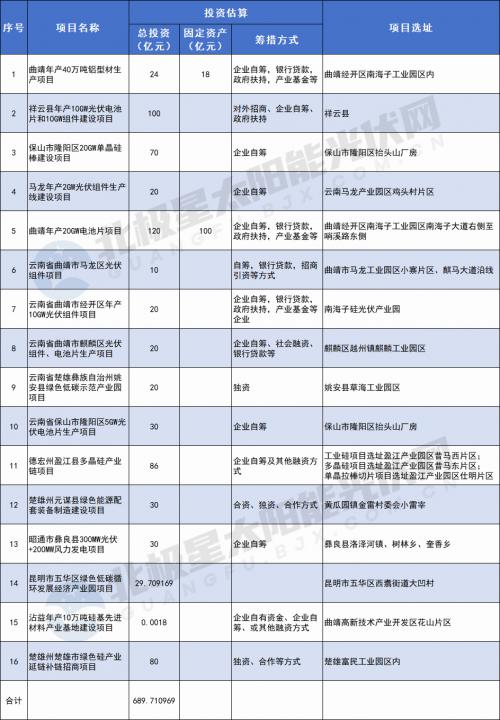 8月8日,云南省投資促進局發(fā)布一批“投資云南”系列重點招商項目,經統(tǒng)計,共涉及16個光伏項目,覆蓋多晶硅、硅棒、硅片、光伏電池、光伏組件、光伏鋁型材以及光伏電站多個生產環(huán)節(jié),項目擬建地點分布于曲靖、楚雄、保山、德宏、昭通、昆明6個市州,項目總投資額超過689億元。