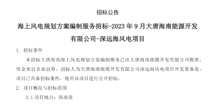 公告顯示,大唐海南能源開發(fā)有限公司按照中國大唐集團(tuán)在瓊“4435”發(fā)展戰(zhàn)略、海南公司“3813”發(fā)展綱要,已完成成為海南省最大的清潔能源供應(yīng)商。下一步,按照海南公司“一基兩翼三極+”發(fā)展新格局,將大力發(fā)展海上風(fēng)電,根據(jù)海南公司海上風(fēng)電發(fā)展需要,編制大唐海南海上風(fēng)電基地規(guī)劃報(bào)告、海南省及東方市海上風(fēng)電上下游產(chǎn)業(yè)鏈發(fā)展規(guī)劃報(bào)告。