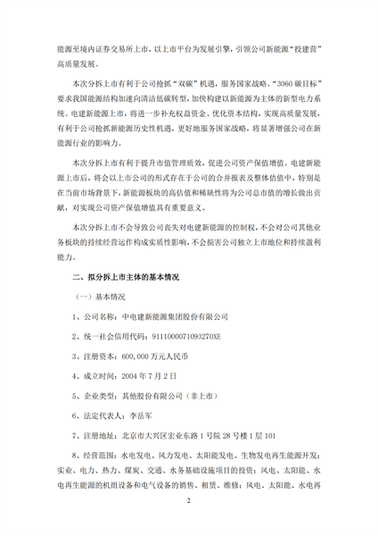 根據(jù)公告,擬拆分的中電建新能源集團(tuán)股份有限公司注冊(cè)資本為60億元,經(jīng)營(yíng)范圍包括水電發(fā)電、風(fēng)力發(fā)電、太陽(yáng)能發(fā)電、生物發(fā)電再生能源開發(fā)等。目前,電建新能源正在推進(jìn)引入戰(zhàn)略投資者相關(guān)工作。