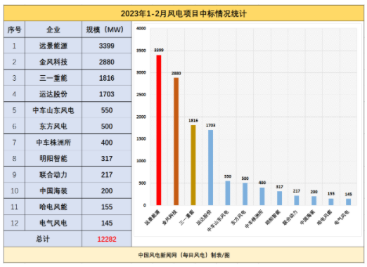 據每日風電統(tǒng)計,2023年1-2月,59個風電項目的中標情況顯示,已開標項目總規(guī)模達12282MW,涉及12家整機商。