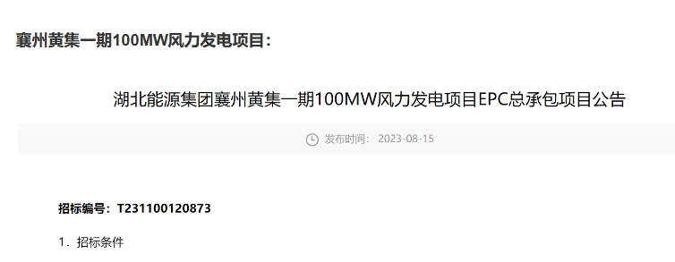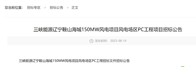8月14、15日,中國三峽電子采購平臺發(fā)布《三峽能源遼寧鞍山海城150MW風(fēng)電項目風(fēng)電場區(qū)PC工程項目招標(biāo)公告》、《湖北能源集團襄州黃集一期100MW風(fēng)力發(fā)電項目EPC總承包項目公告》。