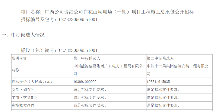 公告顯示,第一中標(biāo)候選人:中國能源建設(shè)集團(tuán)廣東電力工程局有限公司,投標(biāo)報(bào)價(jià):10399.000000萬元。第二中標(biāo)候選人:鐵十一局集團(tuán)建筑安裝工程有限公司,投標(biāo)報(bào)價(jià):10561.915935萬元。